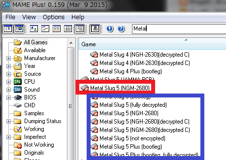 下画像の赤枠が「原作ROM」、青枠が「クローンROM」です。※例:Metal Slug 5